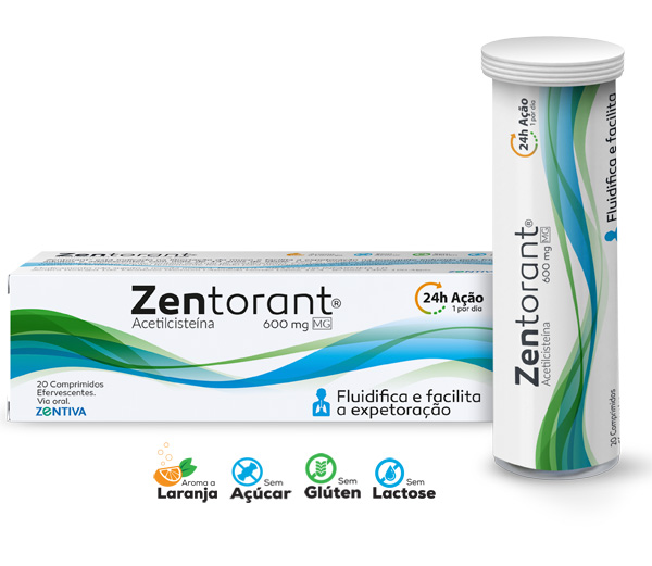 ZENTORANT 600 mg comprimidos efervescentes é um Medicamento Não Sujeito a Receita Médica que contém 600 mg de acetilcisteína (substância ativa) e 194 mg de sódio (excipiente com efeito conhecido) por comprimido efervescente. Indicações: (Adultos e adolescentes com idade > 14 anos) libertação do muco; facilita expetoração na bronquite induzida pelo frio. Toma máxima durante 5 dias. Contraindicações: se for alérgico à substância ativa ou a qualquer outro componente deste medicamento; não deve ser tomado por crianças e adolescentes com idade < 14 anos. Advertências e precauções: Asma brônquica, úlcera péptica, reações cutâneas graves de Stevens-Johnson e síndrome de Lyell, intolerância à histamina, administrar com precaução em doentes com diminuição do reflexo de tosse. Contém 194 mg de sódio por comprimido (10% da ingestão máxima diária recomendada pela OMS). Efeitos indesejáveis: Pouco frequentes – hipersensibilidade, cefaleia, acufenos, taquicardia, vómitos, diarreia, estomatite, dor abdominal náuseas, urticária, angioedema, prurido, febre e hipotensão arterial. Leia atentamente o Folheto Informativo e, em caso de dúvida ou de persistência dos sintomas, consulte o seu médico ou farmacêutico. Baseado no RCM de 02-10-2020